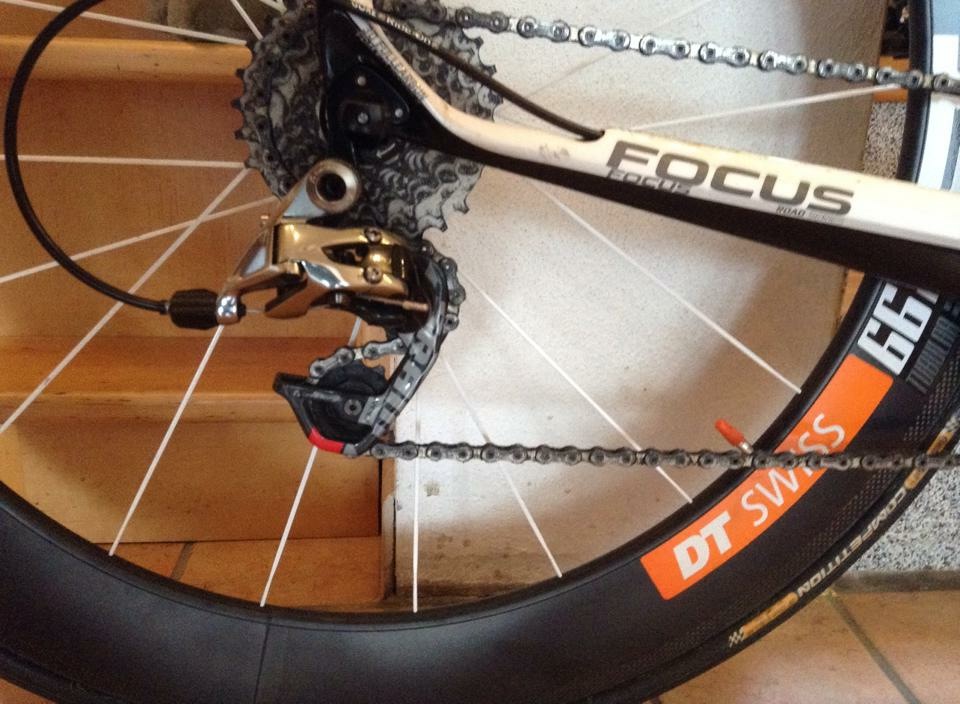 DT Swiss Carbonräder 46vorne, 66hinten mit weissen Aerospeichen, bei Bedarf ist noch ein AeroCarbon TRI Aufsatz dabei. Übersetzung: 39/53vo. 11/28hi. UCI Zulassung, Keine Kratzer, oder Risse. Top Zustand