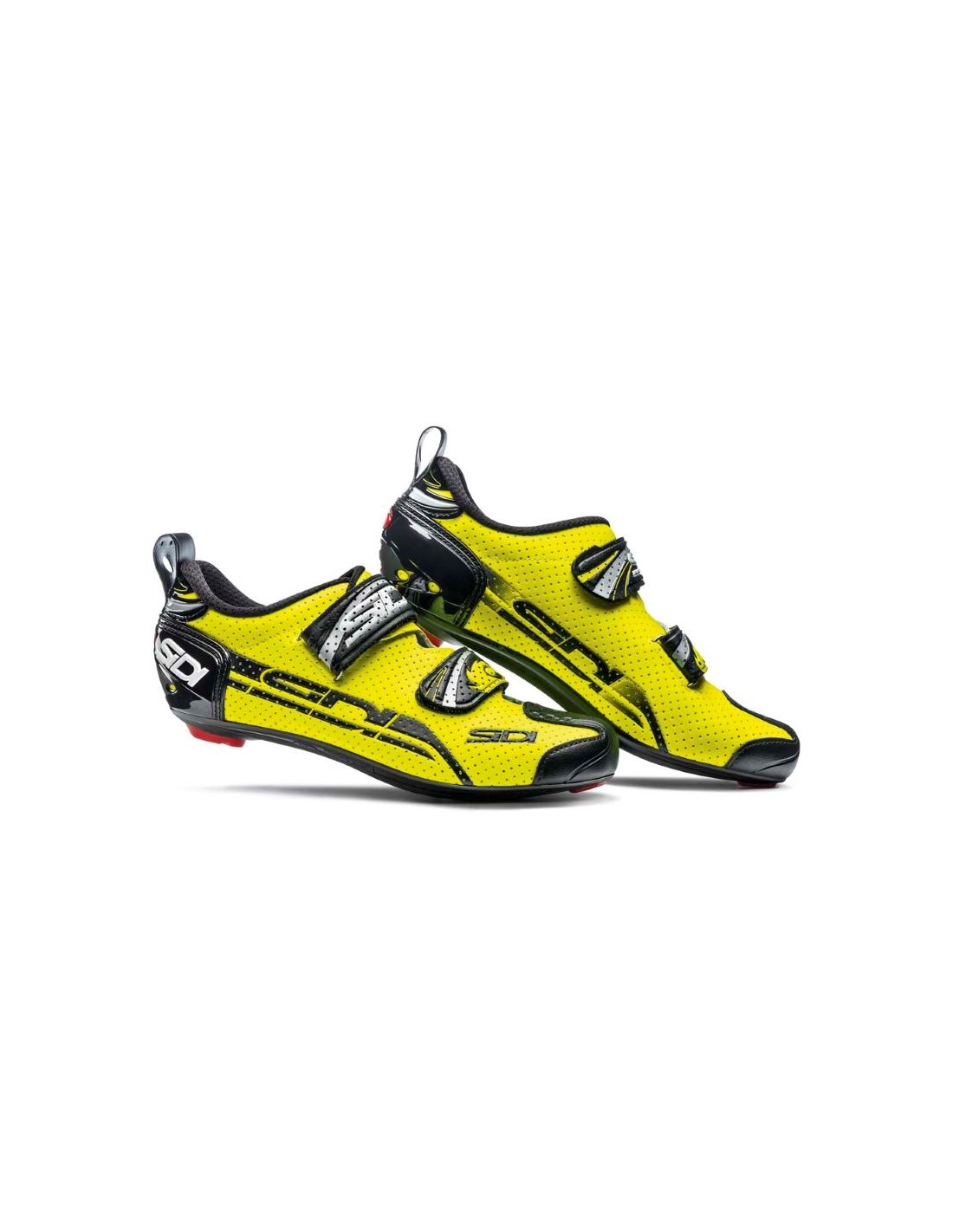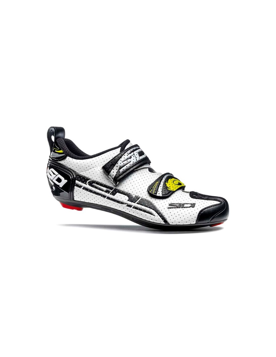 Telefon: +43 (0) 676 9578368Schuhe Triathlon Sidi T4 Air Carbon Neu Verfügbare Farben: Yellow Fluo Black: 43,5, 44 (bitte beachten, das Gelb ist ein Neongelb, leider kommt, das am Bild nicht richtig rüber) White/Black: 45 DETAILS Der leichte T4 Air Carbon Composite Triathlonschuh hat ein extrem-perforiertes Obermaterial, das den Fuß hervorragend atmen und Wasser optimal abfließen lässt, und ein weiches Innenfutter, wodurch der Schuh auch ohne Socken getragen werden kann. Zwei breite, spiegelverkehrt angeordnete Klettverschlüsse lassen sich schnell öffnen und schließen und erlauben, zusammen mit der großen Lasche an der Ferse einen fliegenden Schuhwechsel beim Wettkampf. Die verstärkte Fersenkappe hält den Fuß in seiner optimalen Position und verhindert, dass der Schuh durch extreme Leistung oder längeren Druck verformt wird. Die Twelve Carbon Composite Sole ist eine carbonfaserverstärkte Nylonsohle mit Vollcarbon-Einsatz, die hervorragende Kraftübertragung in Verbindung mit Flexibilität im Vorfußbereich, und damit eine ideale Kombination aus Steifigkeit und Komfort, bietet. Sie hat eine standartmäßige 3-Loch-Bohrung, ist mit allen gängigen Pedalsystemen kompatibel, eine Ausrichtungsskala, die die optimale Positionierung der Pedalplatten erlaubt, und einen austauschbaren Kunststoff-Absatz. Preis 109.- statt 199.- Versand nach D 6,5 Ö 5- andere Länder auf Anfrage