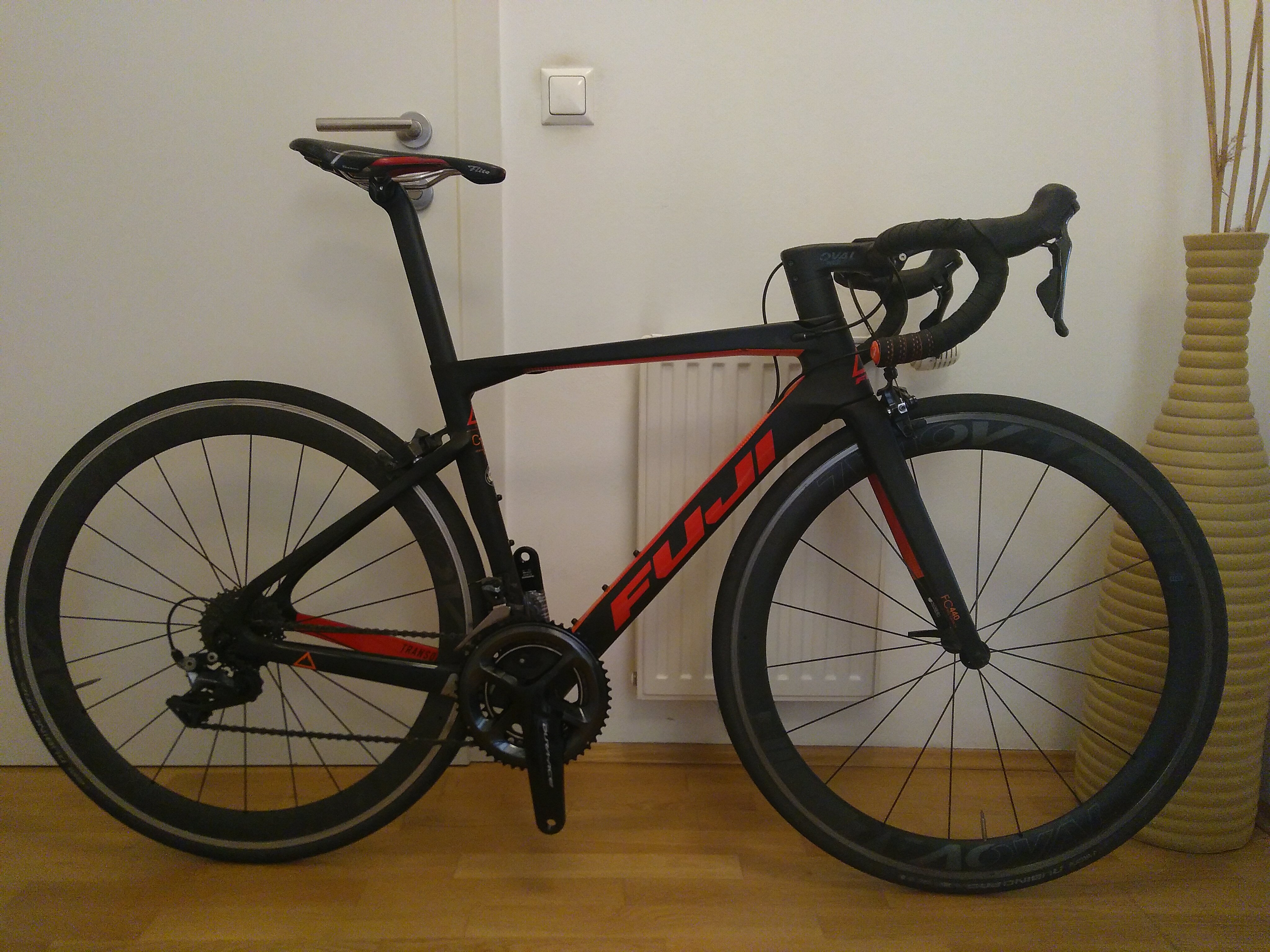 Verkaufe Fuji Transonic 2.1 Rennrad, Jahr 2020 Größe XS/49 Dura Ace 11fach Ausstattung inkl. komplett neuer (!) Kurbel (170mm, MidCompact 52/36Z), wahlweise mit sehr wenig gefahrener Original Kassette 11-30 oder alternativ 11-28 DirectMount-Bremsen, diese bremsen deutlich besser als herkömmliche Rennradbremsen, neue Bremsbeläge gebe ich dazu Ungekürzte Gabel, es sind also noch alle Einstellungsmöglichkeiten offen Selle Italia Flite Sattel mit Aussparung in der Mitte in Radfarbe schwarz-rot Anonsten Original-Ausstattung - Rahmen: C10-Carbon mit hohem Modul, integriertes Steuerrohr mit 1 1/2 '' tiefer, PF30 BB, doppelte Wasserflaschenhalterungen, übergroße Kettenstreben, Carbon-Ausfallende mit austauschbarem Aufhänger - Gabel: FC-440 Vollcarbon mit konischem Carbonschaft - Kurbelgarnitur: Shimano Dura-Ace, 52 / 36T (NEU) - Innenlager: Praxis PF30 Umbau Innenlager - Umwerfer: Shimano Dura-Ace, zum Anlöten - Schaltwerk: Shimano Dura-Ace, 11-fach - Schalthebel: Shimano Dura-Ace, STI, 2x11-fach - Kassette: Shimano Dura-Ace, 11-30T, 11-fach - Kette: Shimano Dura-Ace, 11-fach mit QuickLink - Laufradsatz: Oval Concepts 950 F, 700c 18 / 24H Aero Carbon-Alufelgen - Reifen: Vittoria Rubino Pro, 700 x 25 c, 150 tpi, zusammenlegbar - Bremsensatz: Shimano Dura-Ace Direktmontage - Bremshebel: Shimano Dura-Ace - Steuersatz: FSA Integriertes 1 1/4 '' oberes - 1 1/2 '' unteres abgedichtetes Lager - Lenker: Oval Concepts 790 Aero Aluminium, 31,8 mm Klammer, 125 mm -Gefälle, 75 mm Reichweite - Vorbau: Oval Concepts 790 Aero, 3D-geschmiedet, -17 ° mit integrierter Computerhalterung - Klebeband / Griff: Anti-Rutsch-Silikon - Sattelstütze: Oval Concepts Transonic Aero, 300 mm, 46-52 cm / 350 mm, 54-61 cm (BEIDE sind mit dabei, inkl. KLEMMUNG für runde und ovale Sattelstreben) - Sonstiges: Garmin Computerhalterung - Schaltauge: D032 Das Rad war mein Zweit-/Wettkampfrad (genutzt bei der Duathlon-WM im Juni22) und wurde entsprechend wenig gefahren, ist natürlich auch sturzfrei. Ich habe eine zweite längere Sattelstütze, sodass das Rad perfekt auch für größere Fahrer(innen) mit längeren Beinen passt, die originale (unbenutzte) Sattelstütze ist ebenfalls mit dabei. Zusätzlich habe ich zwei Sattelklemmungen, eine für runde (unbenutzt) und eine für ovale (Carbon-)Sattelstreben. Je nach Verhältnis von Körpergröße zu Beinlänge passt das Rad bis zu 175cm Körpergröße (Hersteller gibt 152-163cm an, allerdings bin ich selbst 171cm groß, Innenbeinlänge 86cm und es hat mir perfekt gepasst! Vorbau ist der Originale mit 90mm verbaut) Mit dabei ist eine Garmin-Halterung direkt am Vorbau, diese kann auch entfernt werden (Abdeckkappe für die Befestigung kommt natürlich auch mit). Gewicht inkl. Hochprofillaufräder 7,5kg, hier lässt sich mit leichteren Wettkampffelgen noch viel herausholen Neupreis 4999,-