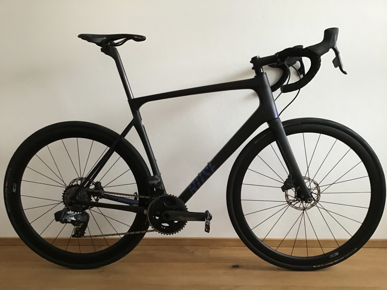 Laufräder: Carbon von Rose (Naben sind von Newmen) mit hinten 47 mm und vorne 37 mm Höhe (Laufradsatz ist ebenso vom neuen Endurancerennrad; hinten hat Felge kleinen oberflächlichen Kratzer (siehe Bilder); Maulweite 19 mm; Reifen Schwalbe Pro One TLE 30 mm mit ca. 800 km Laufleistung (siehe Fotos) und mit Schläuchen montiert.