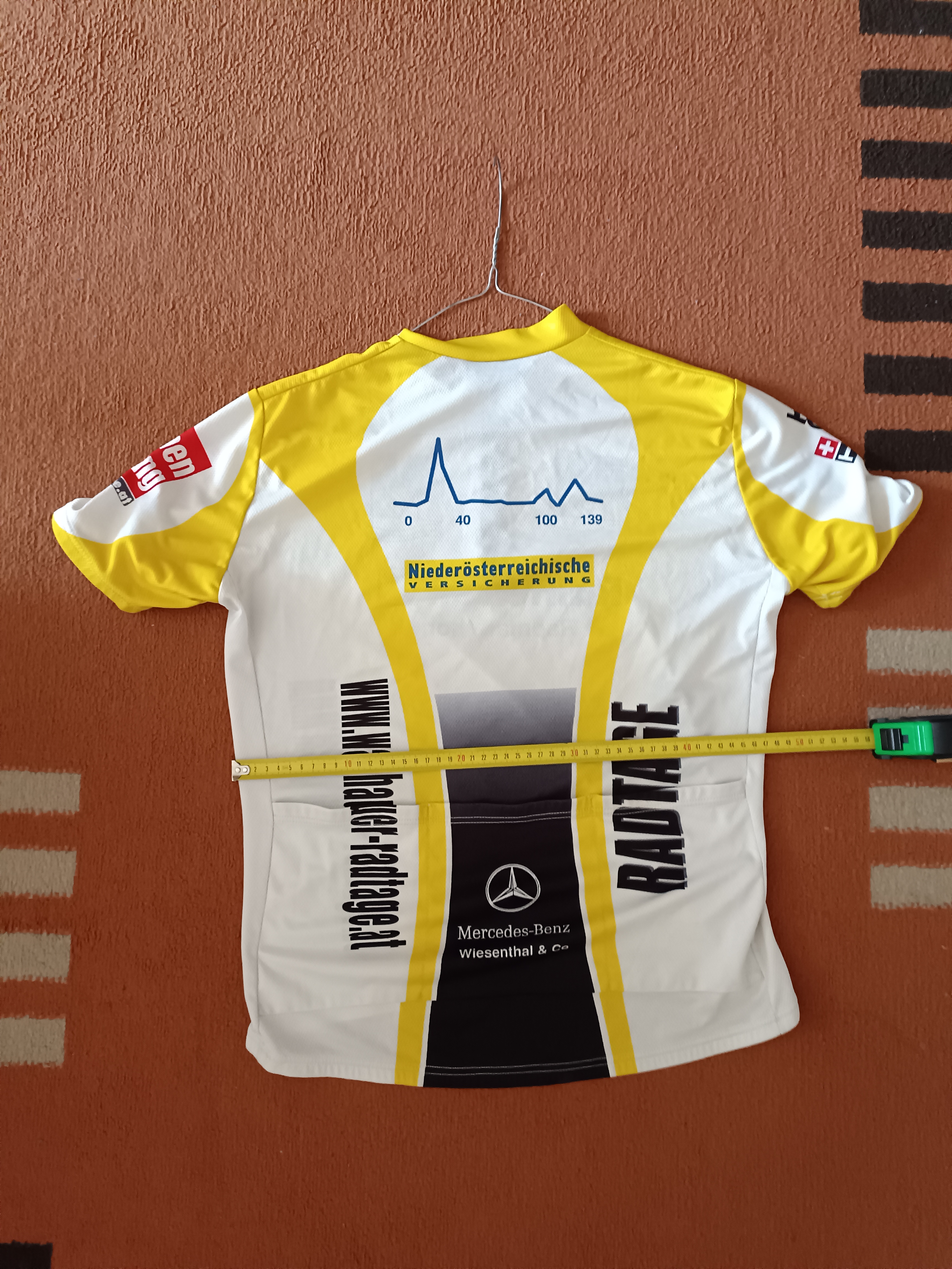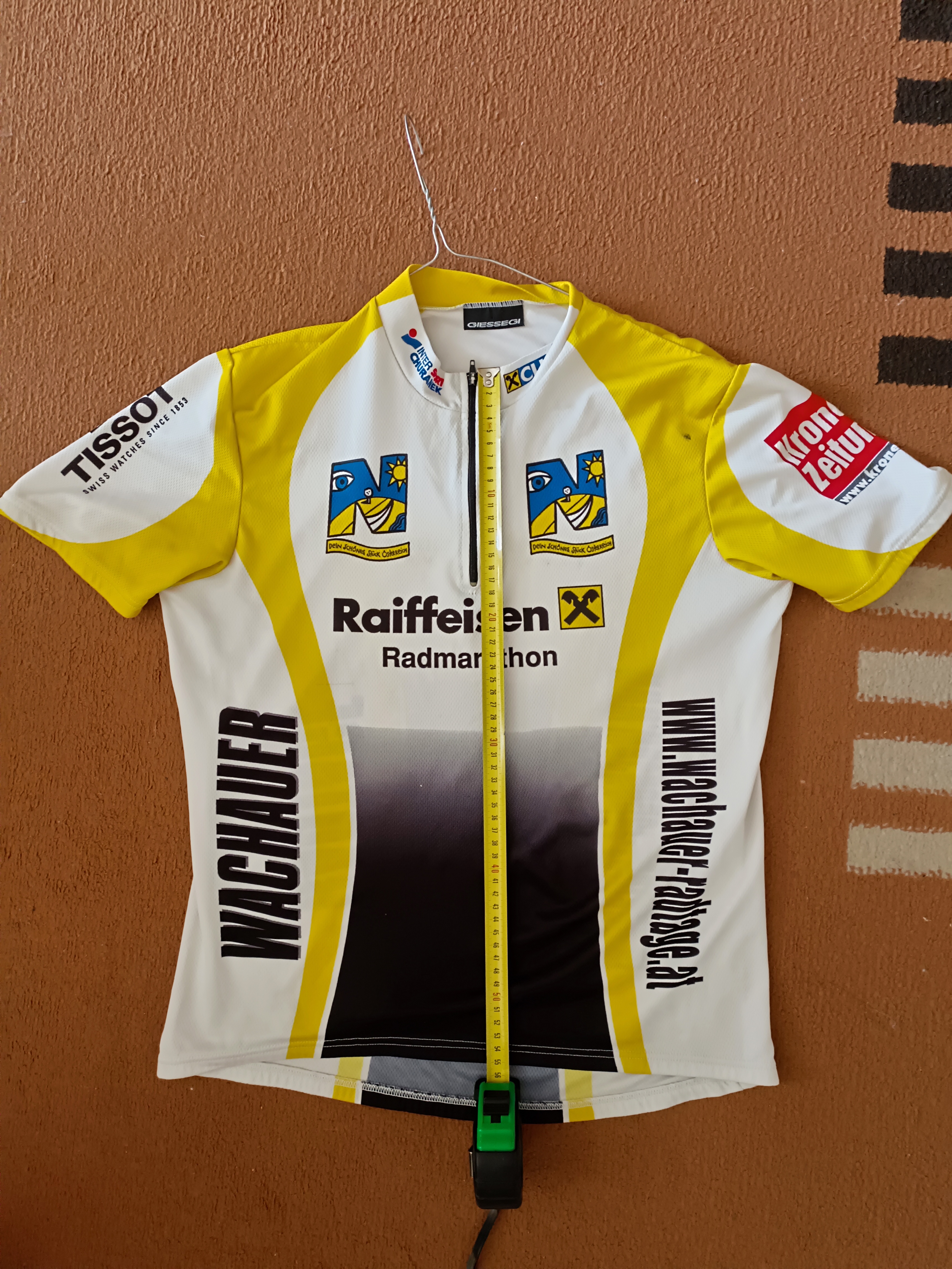 Telefon: 0699/11004826Verkaufe Finisher Trikot Wachauer Radsporttage Trikot Wachauer Radtage (Wachauer Radmarathon), 139km Strecke Größe "M". Weite siehe Foto, durchgehender Zipp mit den Sponsoren Tissot, Kronenzeitung, Raiffeisen, Mercedes-Benz und Wiesenthal & CO Guter gebrauchter Zustand mit 3-fachen Rückentaschen ideal für den Sommer - schnelltrocknend, Sammlerstück für Körpergröße ca. 180 cm und max. 75 kg, ich bin leider hinausgewachsen Verkaufspreis € 9,-- wir sind ein tierfreier Nichtraucherhaushalt Privatverkauf - keine Garantie, keine Gewährleistung und auch keine Rücknahme Die Versandkosten gehen zu Lasten des Käufers. Es ist auch eine versandkostenfreie Übergabe im Tullnerfeld nach vorheriger Absprache möglich......abhängig vom Wohnort des Käufers. Ich arbeite in Wien. Auch hier besteht die Möglichkeit einer kostenfreien Übergabe bei einer U-Bahn Station.