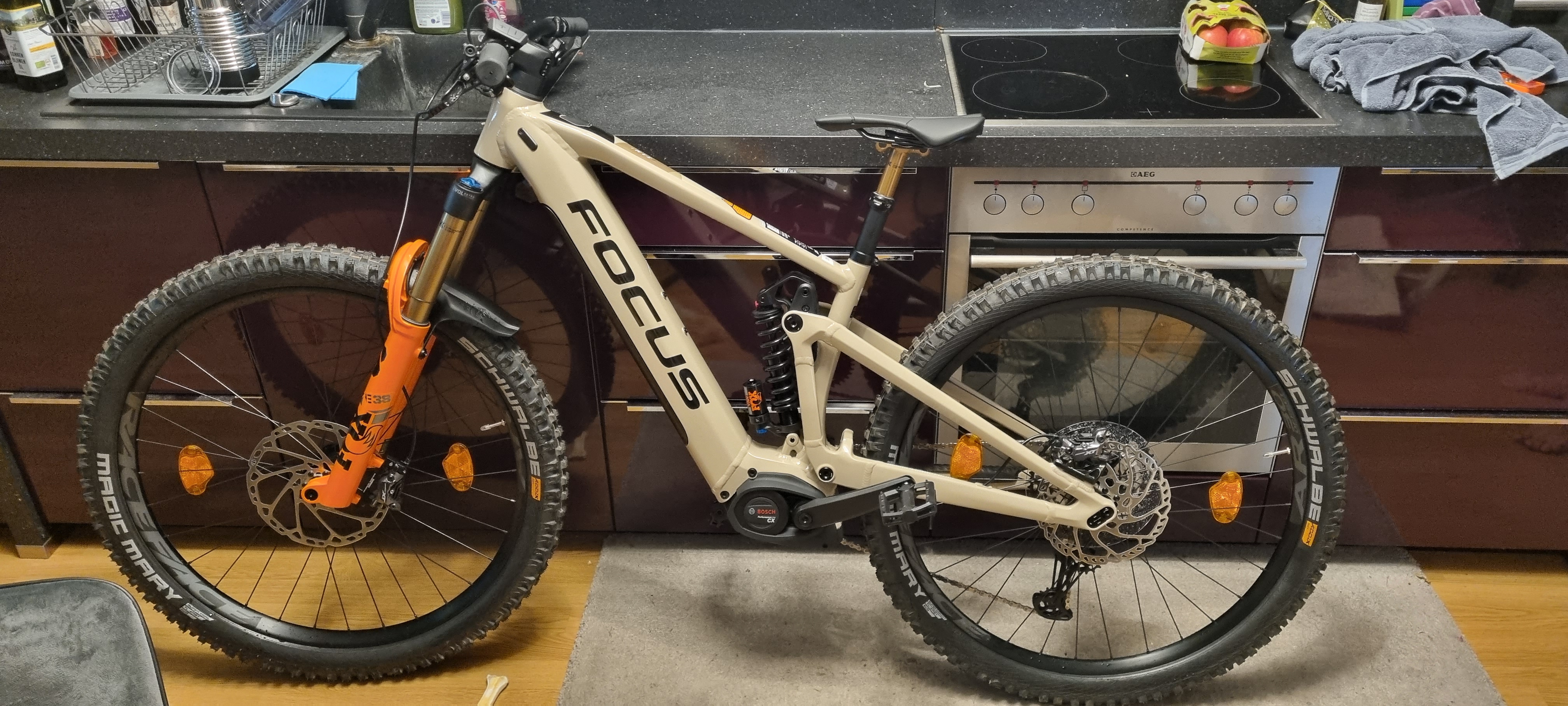 Telefon: 06603928472Das Bike ist komplett NEU und ungebraucht und wurde nicht gefahren. Größe S (41)/29 Zoll kompletten Datasheet auf: https://www.focus-bikes.com/at_de/archive/e-bike/focus-sam/pdp-focus-sam-2021-2022-bosch Ladegerät, Handbücher usw. noch komplett verpackt; Akku wurde nie aufgeladen. Bike steht bei mir seit 02.08., also tatsächlich noch komplett neu. Preis VB Besichtigung selbstverständlich möglich. ----------------------------------------------------------------------- IM ÜBERBLICK e-Bike Typ e-Mountainbike Modelljahr 2022 Motorunterstützung 25 Schaltung Hersteller Shimano Schaltungstyp Kettenschaltung Federung Fully Bremsentyp Hydraulische Scheibenbremse Farbe braun, beige Rahmengröße 41 Reifengröße 29+'' Rahmenform MTB Fully ANTRIEBSEINHEIT Motor Bosch Performance Line CX 4.0 36V 250W Akku 625 Wh Display Bosch Purion SCHALTUNG & ANTRIEB Schaltung Shimano Deore XT M8100, 12-Gang Kettenschaltung Schalthebel Shimano Deore XT M8100, 12-Gang Schaltwerk Shimano Deore XT M8100, 12-Gang Kurbelsatz Samox EC40 ISIS, 165 mm Kassette Shimano SLX M7100, 12-Gang, 11-51T RAHMEN & GABEL Rahmen 7005 Aluminium, hydroformed, 3D forging, 170 mm F.O.L.D. Kinematik, 148 x 12 mm Steckachse, integrierte Kabelführung Gabel FOX 38 Float Factory 29, E-Bike, Grip2, 110 x 15 mm, 44 mm rake, 170 mm Federweg Steuersatz Acros ZS56/ZS56, FOCUS C.I.S. integriert Dämpfer FOX Van Performance Coil, 230/65 mm, hardware: 25,0 x 8,0 mm, 170 mm Federweg BREMSE Bremsanlage Shimano XT M8120, hydraulische Scheibenbremse, 4-Kolben, 200 mm LAUFRÄDER Felgen RaceFace AR30 Offset Naben (V/H) Novatec D041, 15 x 110 mm / Novatec D162 Disc, 12 x 148 mm Reifen Schwalbe Magic Mary 2.6, v: Super Trail Soft/h: Gravity Soft COCKPIT Lenker RaceFace Chester 35, Alu, 780 mm, Rise: 35 mm, Backsweep: 8° Vorbau FOCUS C.I.S. integriert, 35 x 50 mm, 0°, Aluminium Lenkergriffe RaceFace Getta Grip Sattelstütze FOX Transfer RL Factory, 31,6 mm Sattel Proxim W350 SONSTIGES Gewicht 26,2 kg Zulässiges Gesamtgewicht 120 kg