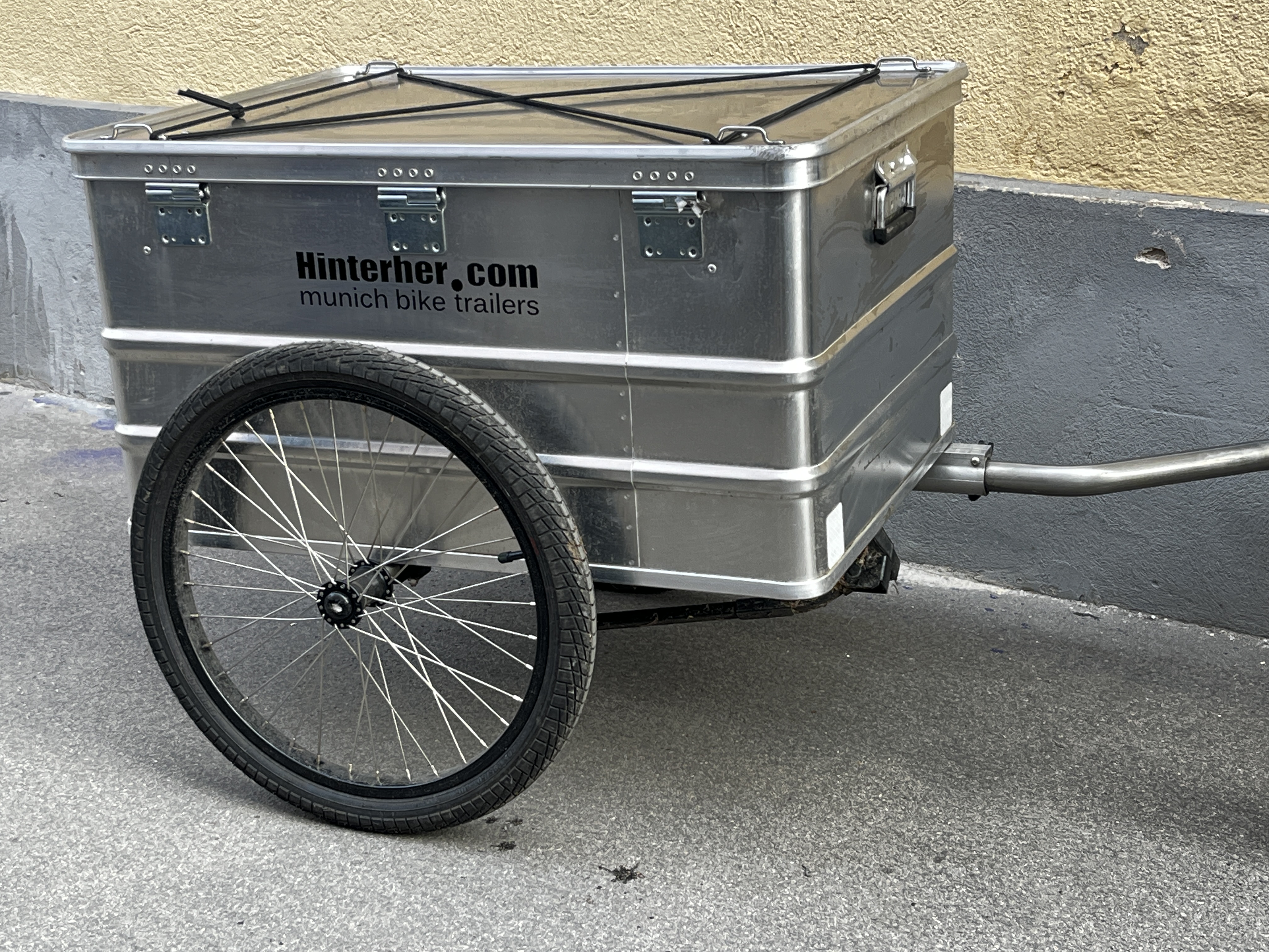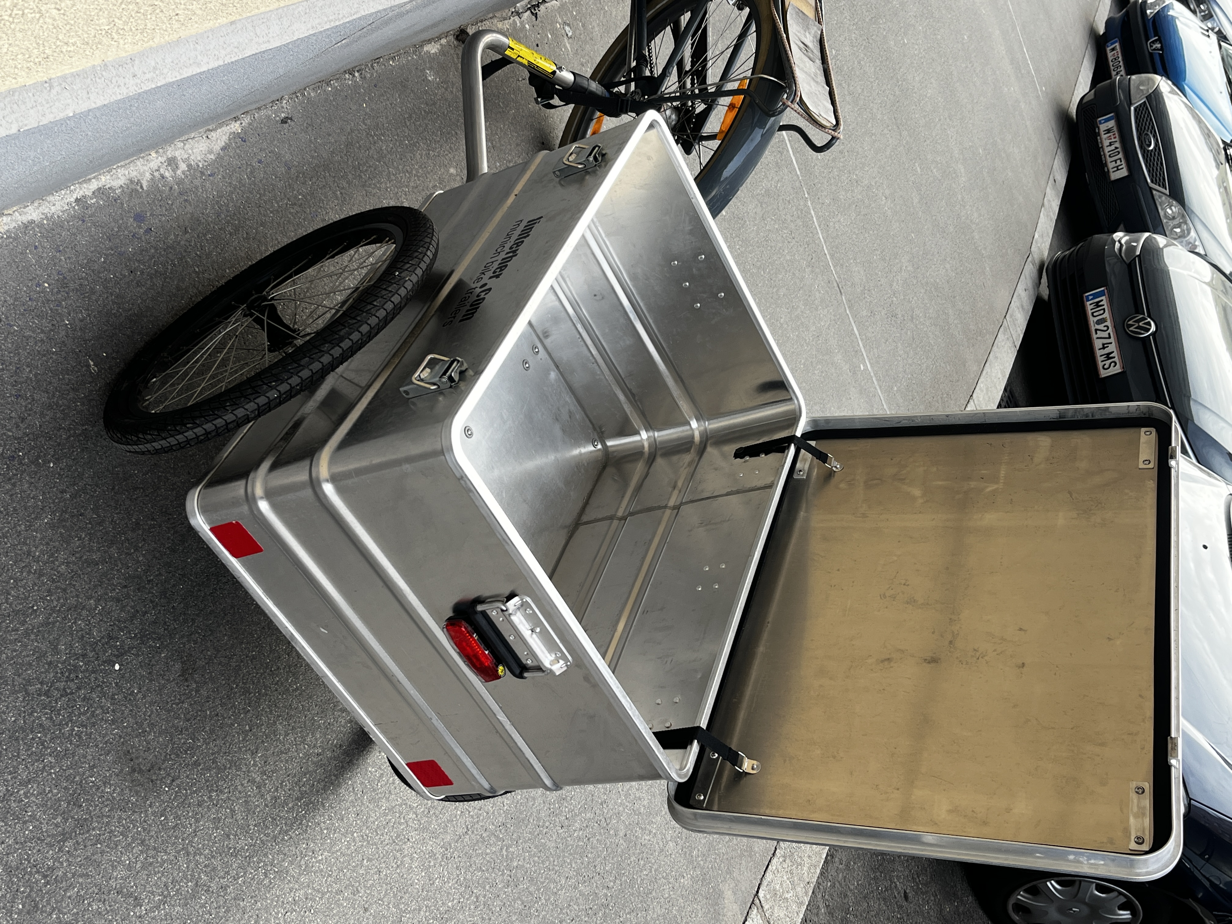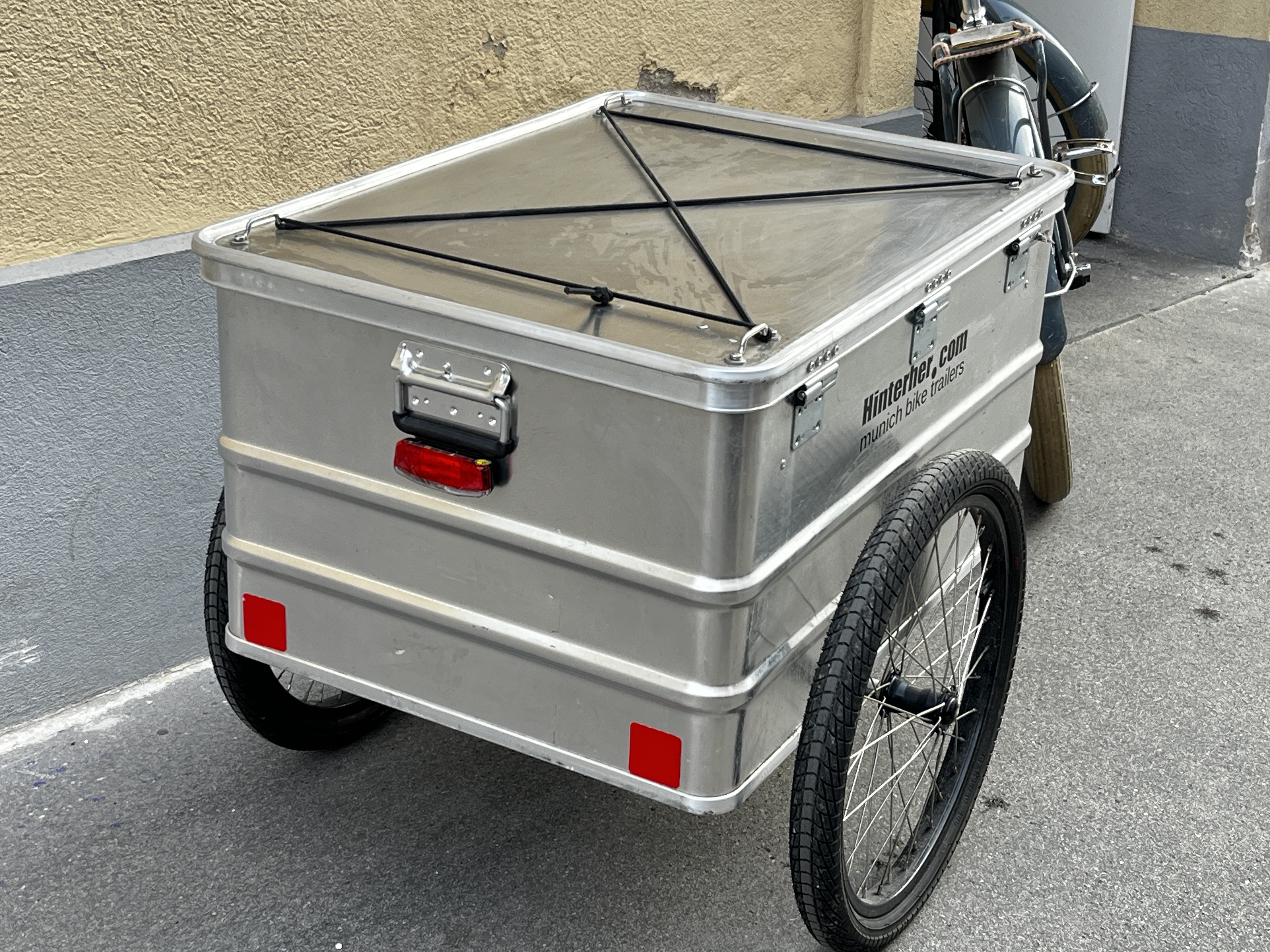 Telefon: +4369910444050Fahradanhänger mit Transportbox ALU 156L HINTERHER Boxenanhänger 156 Liter (Hxxl-Box) Standardausstattung Alubox ca. L80 x B60 x H41 cm Deckel abschliessbar mit 2 gleichschliessenden Spannverschlüssen Grundplatte Siebdruckplatte Multiplex, verklebt und gebohrt incl. Standarddeichsel, Deichseldapter LED-Rücklicht, an der Rückseite der Box verschraubt durchgehende Edelstahlachse + Aluklemmblöcke Bereifung 20" schwarz Schwalbe Big Apple Ursus Ständer Gesamtgewicht 22,5 kg / Max Gesamtgewicht 100kg Deichsel SL - Standarddeichsel, absperrbar, Aufpreis SL- Deichselaufnahme Anhängerkupplung WEBER ES,