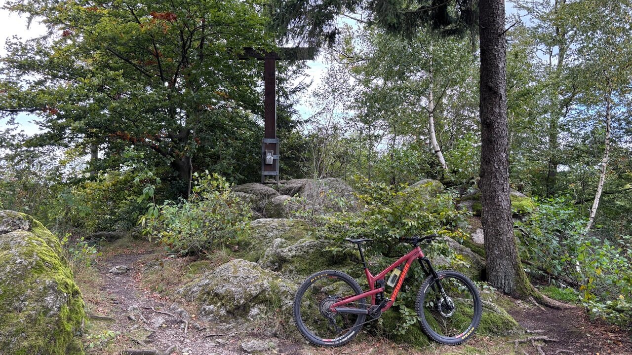 Ja die Landschaft ist nett und von ein paar Ausreißer abgesehen (eben die Treppen oder -kurze - Schiebepassagen die ganz leicht auf normalen Wegen umfahren werden könnten) auch ganz gut gewählt. Der Teufelsarsch muss natürlich - so wie bei jedem Blinduro - dabei sein. Auf mühsamen.wurzeldurchsetzten Singletracks folgen dann wieder Asfaltkilometer wo man schnell vorankommt. Trotzdem sinkt der Schnitt jetzt schon auf unter 14. Zudem haben sich auch 2 Schrauben von der Scheinwerferbefestigung von mir unbemerkt gelöst - muss ich mich morgen drum kümmern.2 Punkte