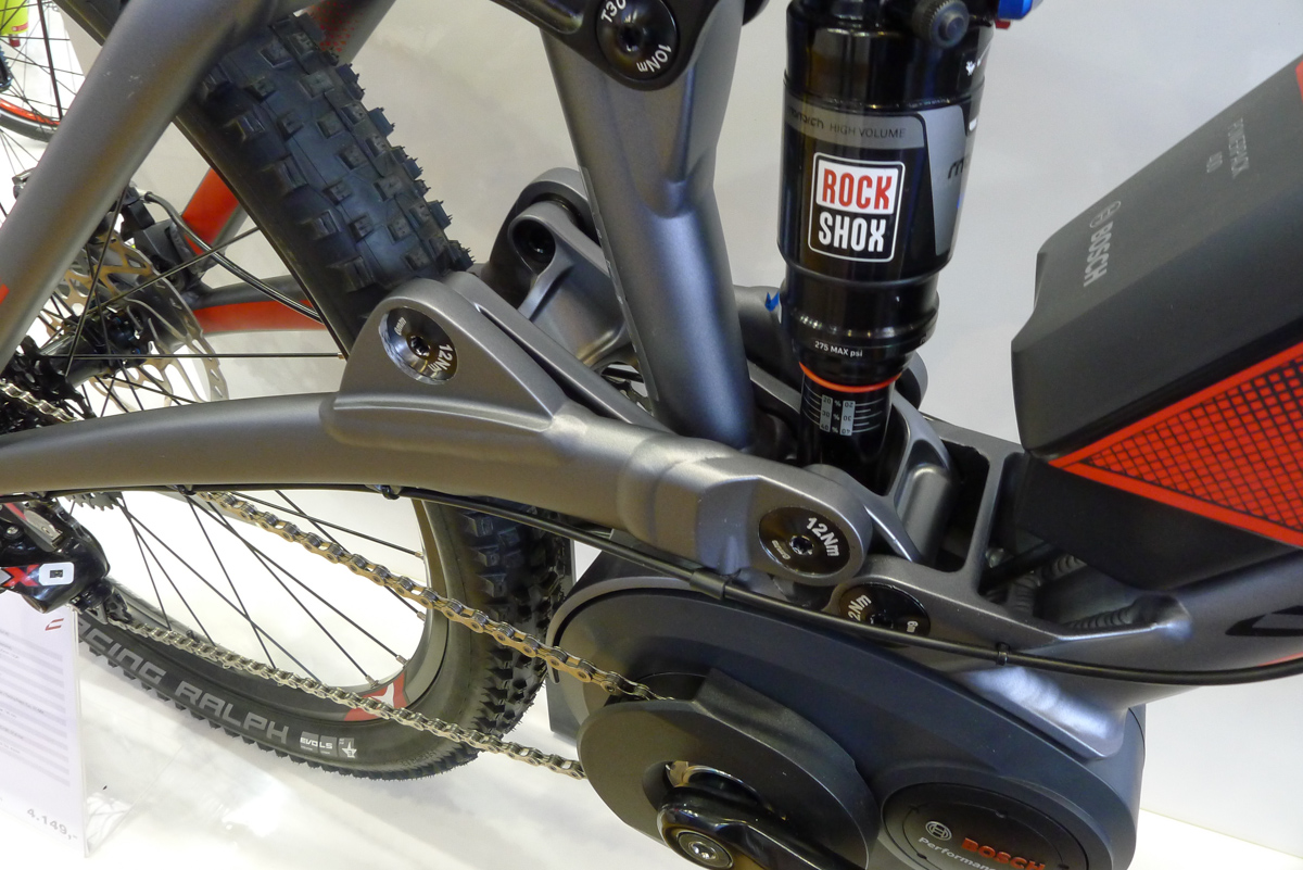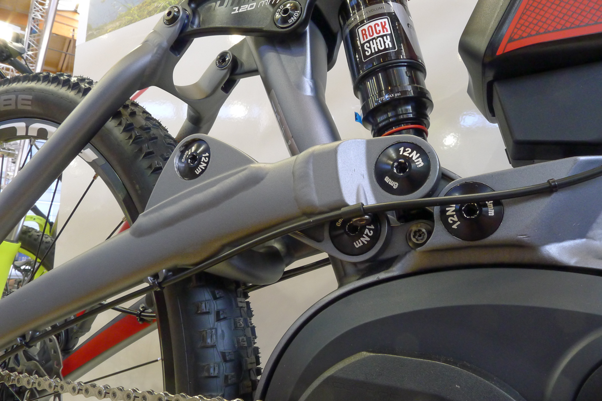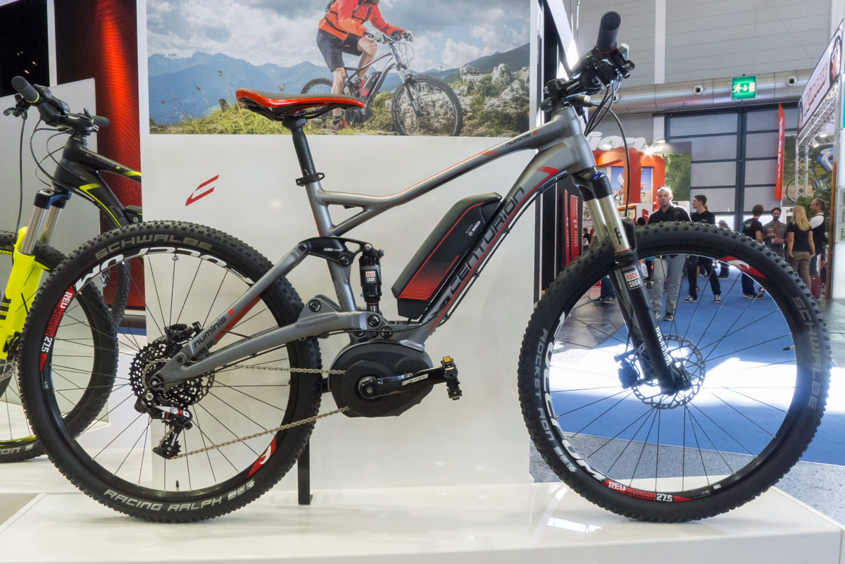 Das Messehighlight vom deutschen Hersteller Centurion präsentierte sich in Form des Numinis Elektrobikes. Das 120 mm Fully mit 27,5"-Laufrädern und 400 Wh-Antrieb von Bosch verfügt über eine virtuelle Drehpunkt-Konfiguration der Federung, die antriebsneutral und hochsensibel funktionieren soll. Eine 142 x 12 mm Steckachse bringt ein Plus an Steifigkeit.