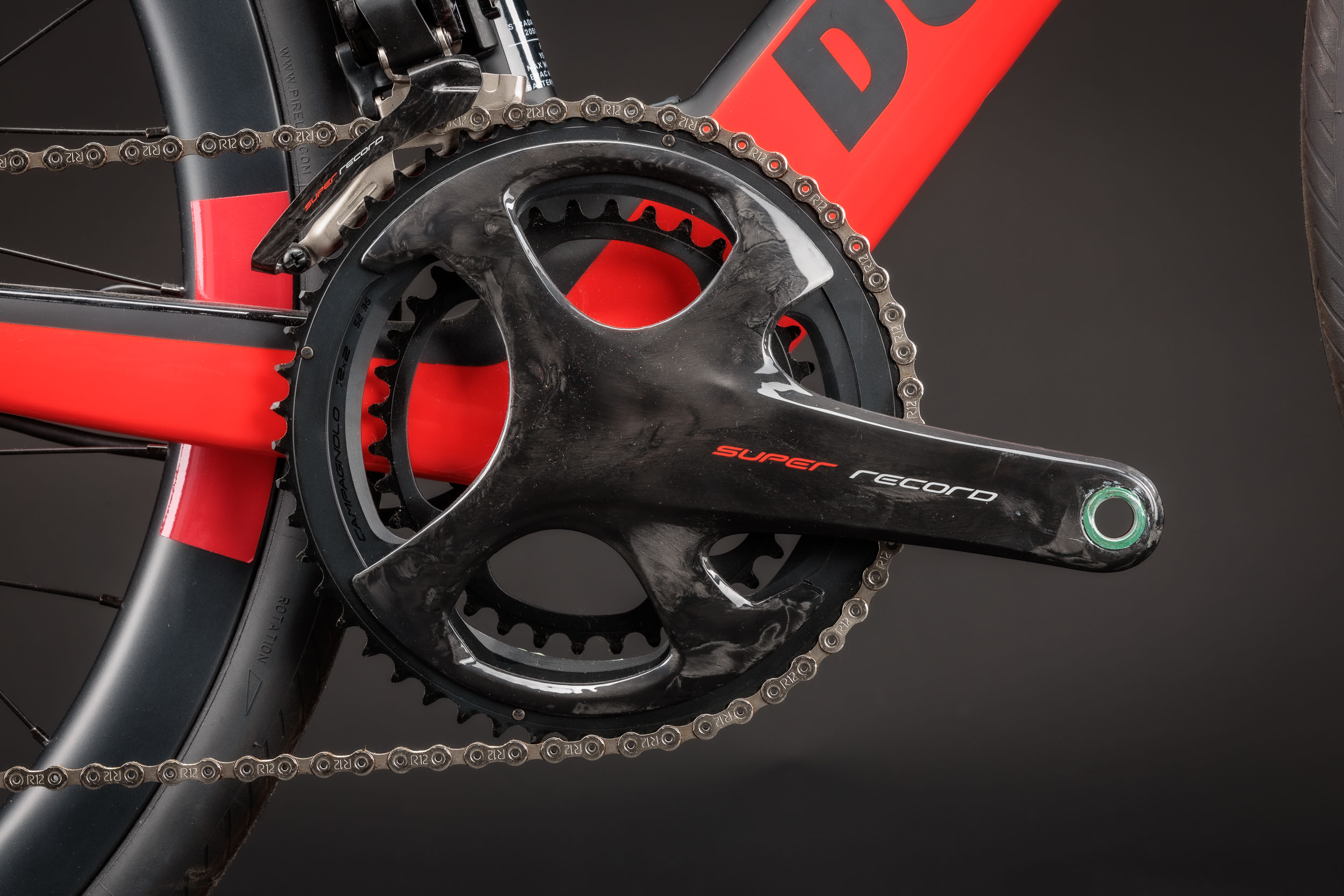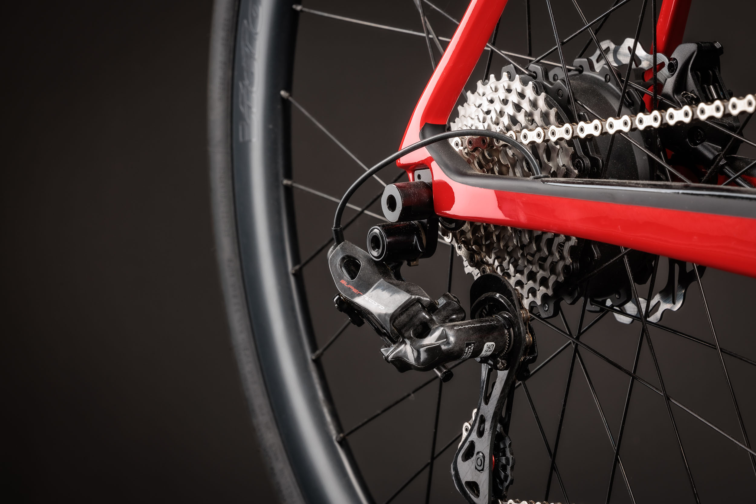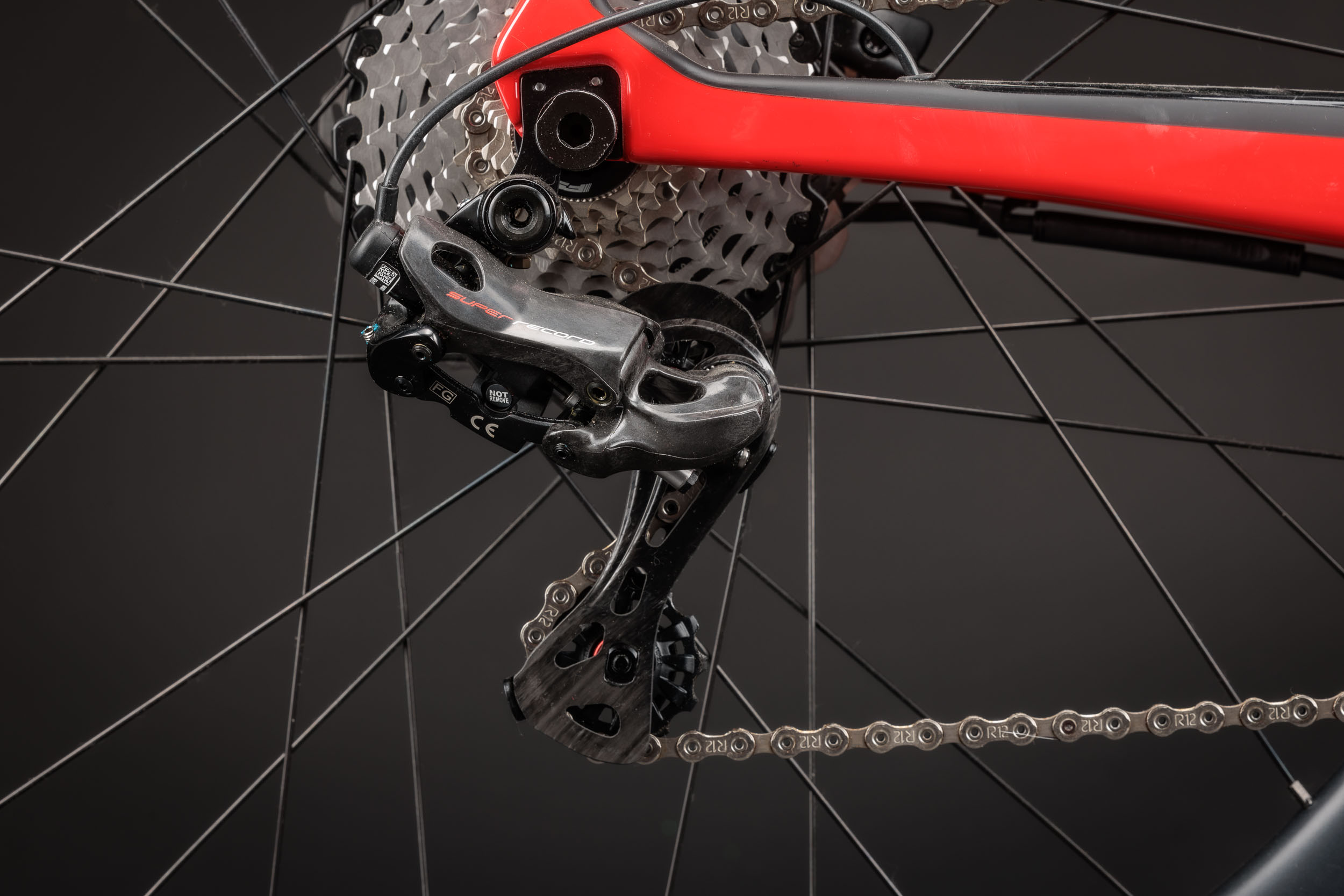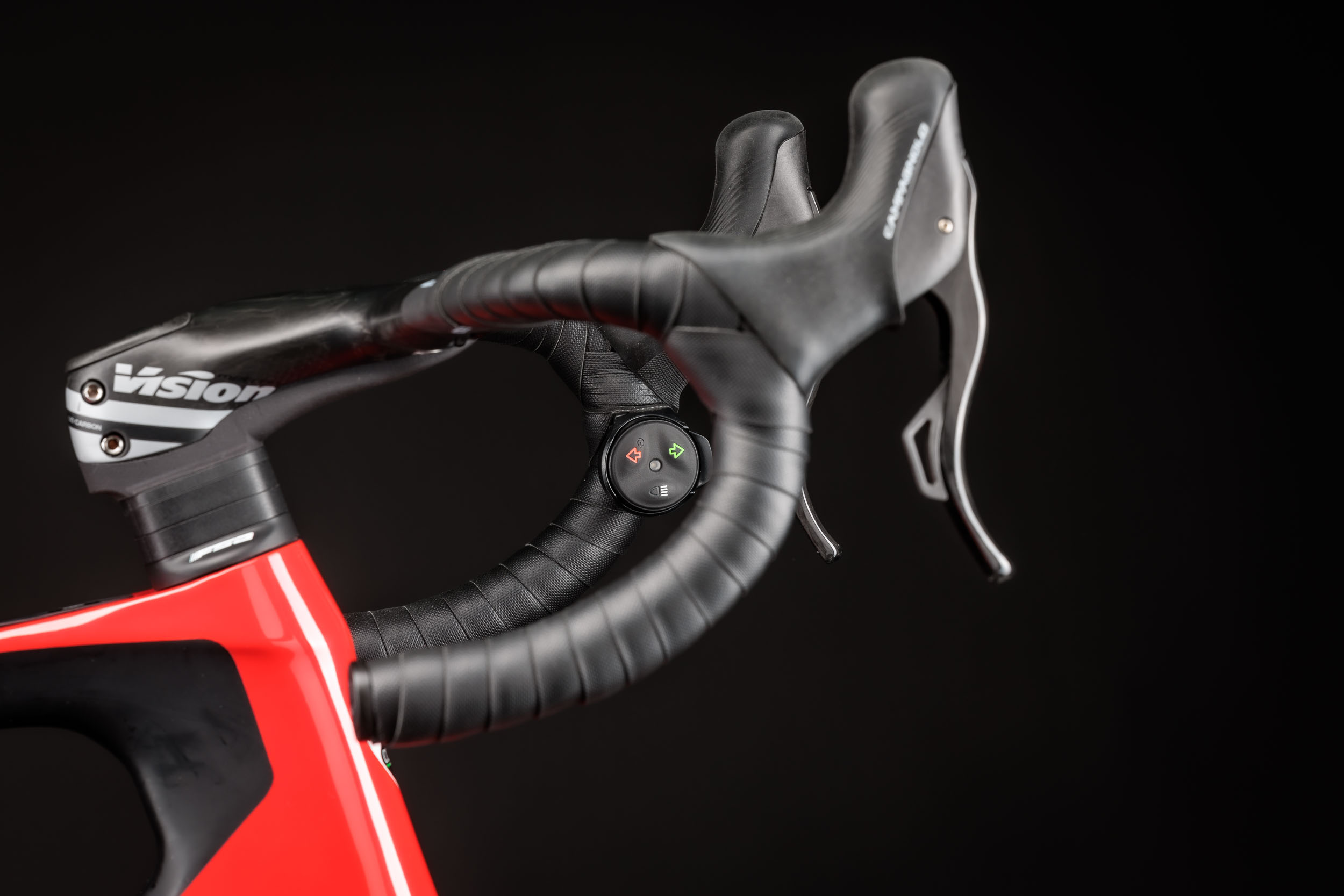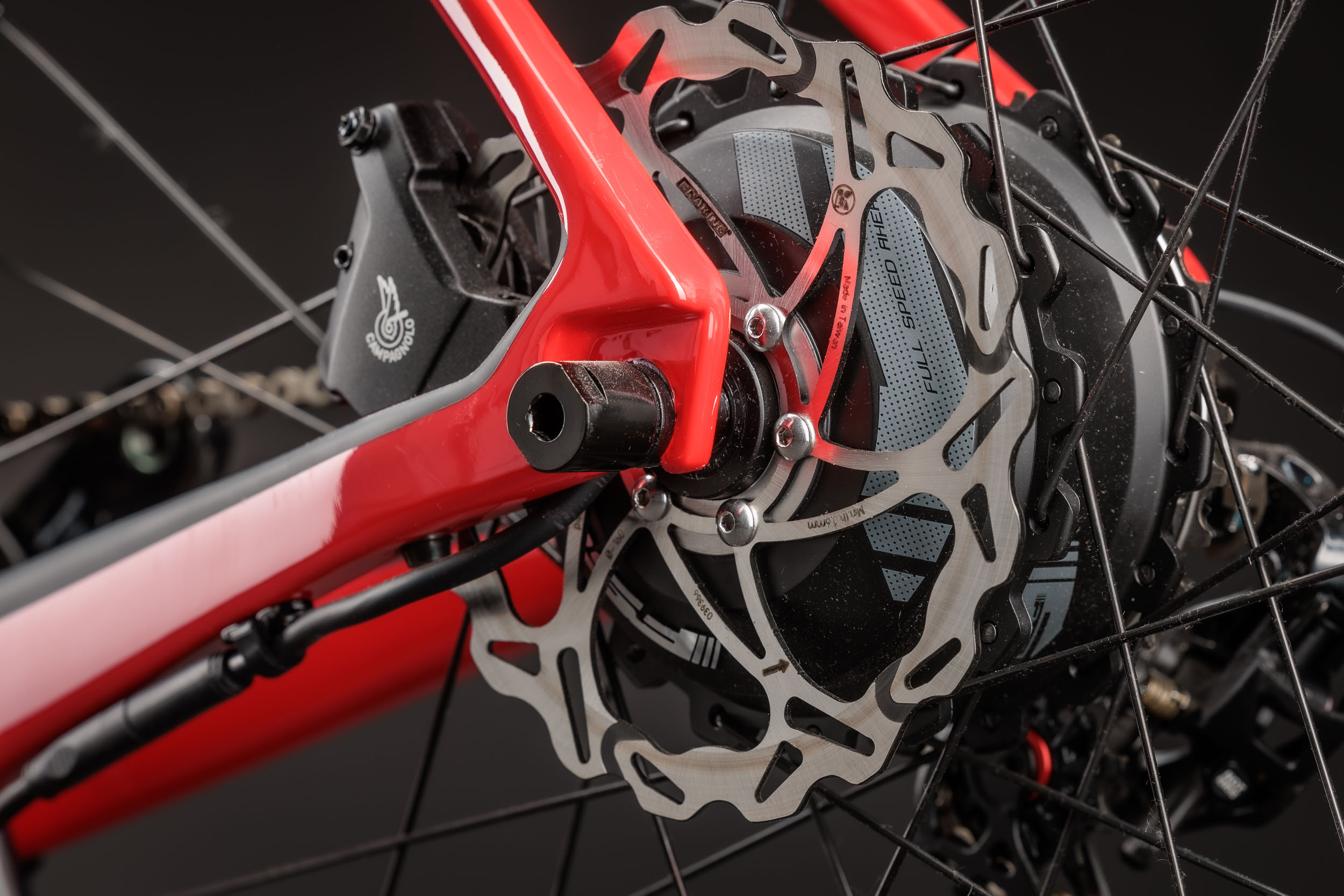 Neben der umfangreichen Ausstattung mit dem FSA Range Extender, der Garmin eBike-Fernbedienung und einem Garmin Edge Explorer Radcomputer verfügt der edle E-Renner über eine elektronische Campagnolo Super Record EPS Schaltgruppe mit 2x12 Gängen, eine Super Record UT Ti 52/36 Carbonkurbel, eine K-Force WE Kassette mit 11-32 Zähnen sowie eine FSA Kette. Aerodynamische Vision Metron 40 SL Räder mit Carbonfelgen und das Vision Metron Carbon 5D Cockpit mit integriertem Vorbau und Aero-Computer-Mount runden das Paket ab.