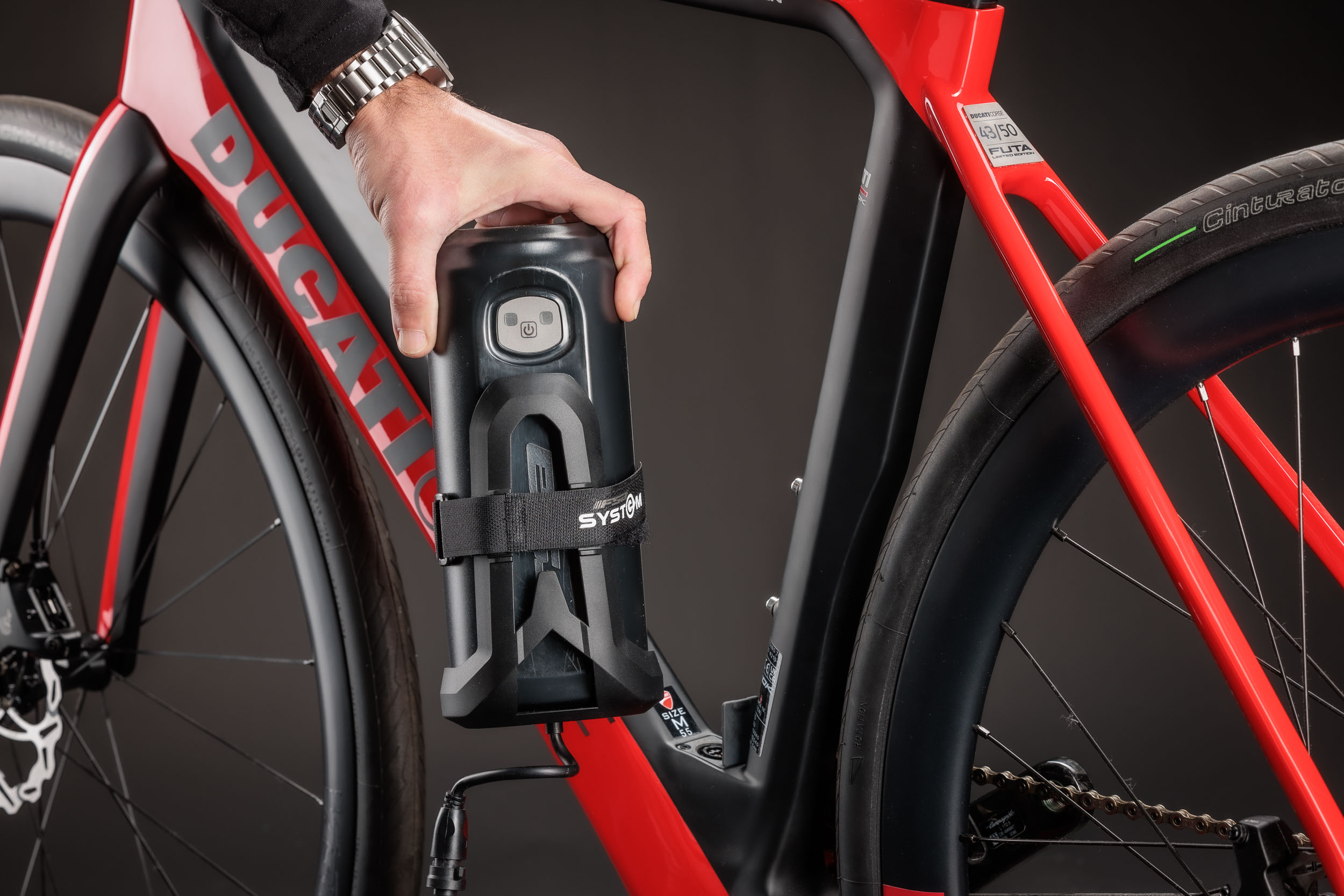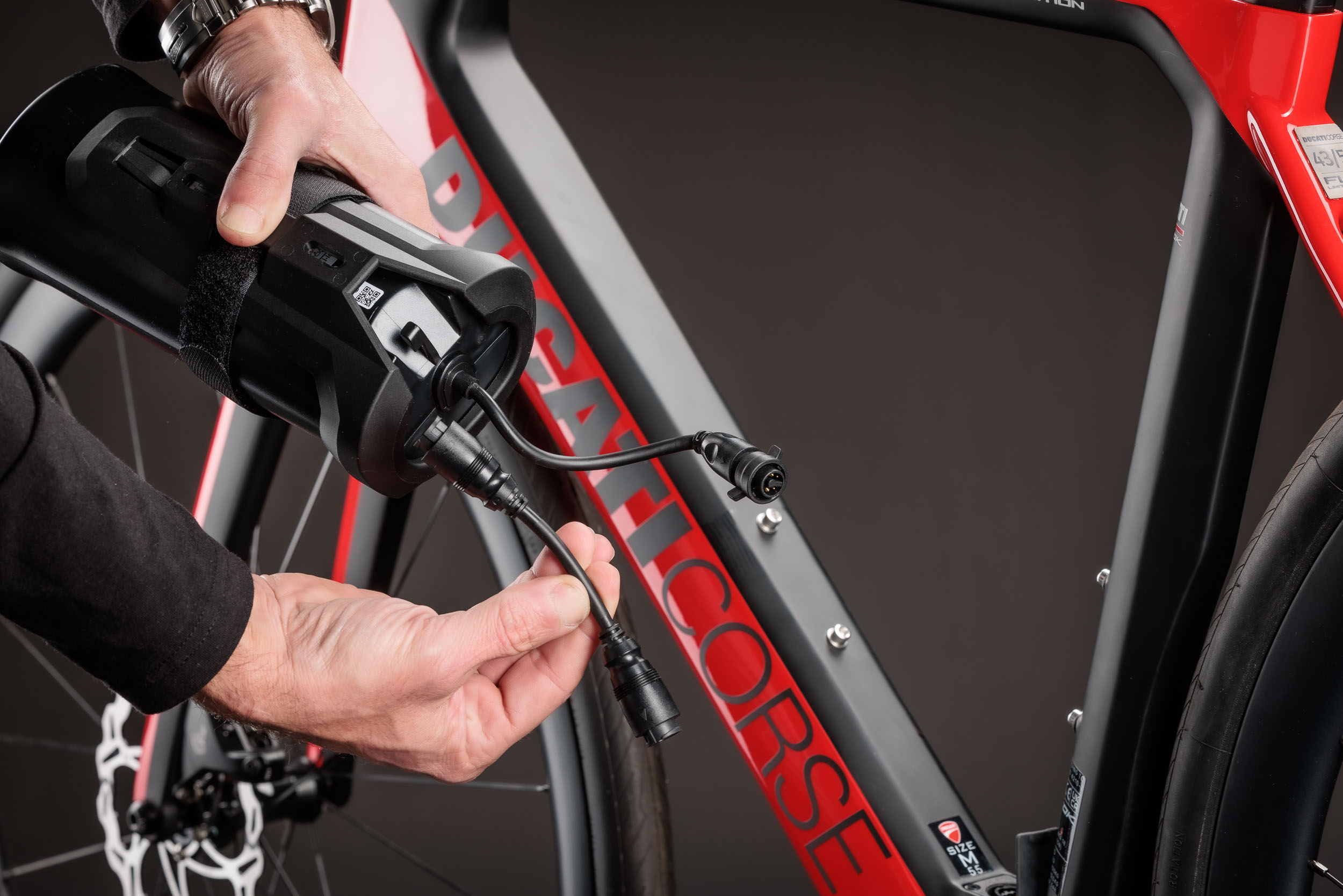 Die Futa E-Rennräder werden von einem FSA HM 1.0 Hinterradnabenmotor mit 250 Watt und 42 Nm Drehmoment unterstützt, der durch einen Li-Ionen-Akku mit 252 Wh im Inneren des Unterrohrs gespeist wird. Ducati gibt eine Reichweite von bis zu 80 km an, die sich mit einem 250 Wh Range Extender verdoppeln lässt. Die Futa Limited Edition ist serienmäßig mit diesem Range Extender sowie einem Garmin Edge Explorer ausgestattet, der spezielle Karten und Funktionen vorinstalliert hat.