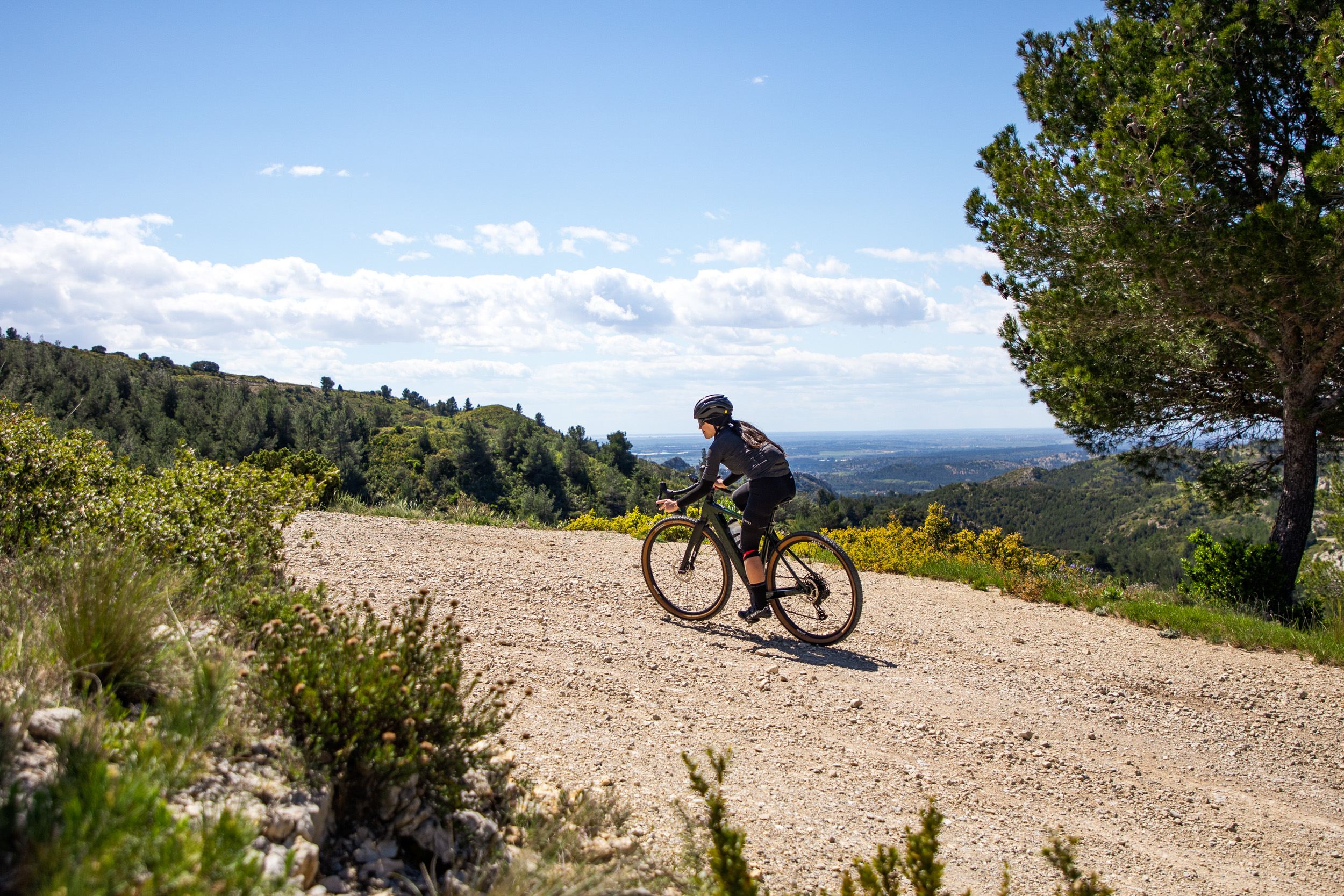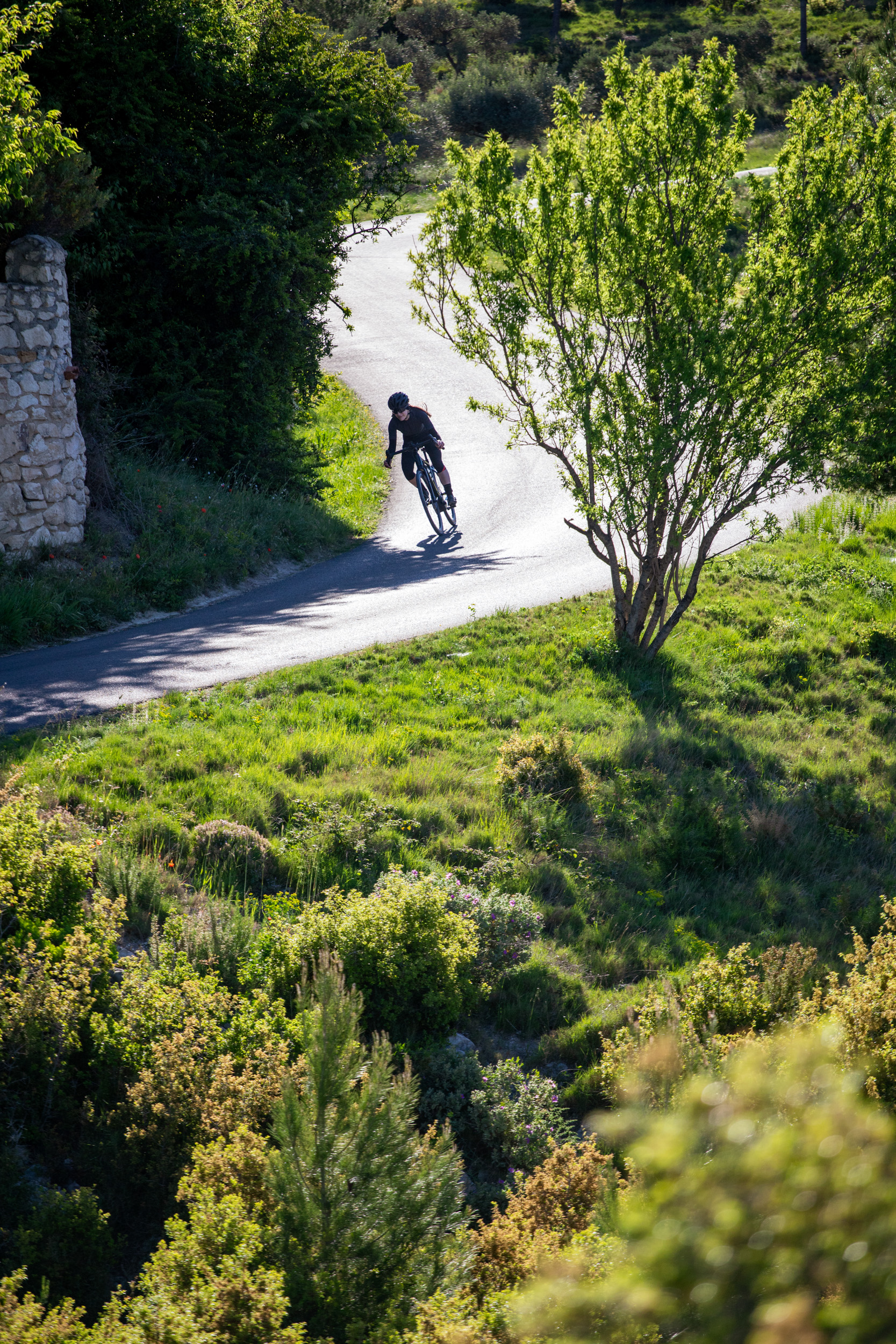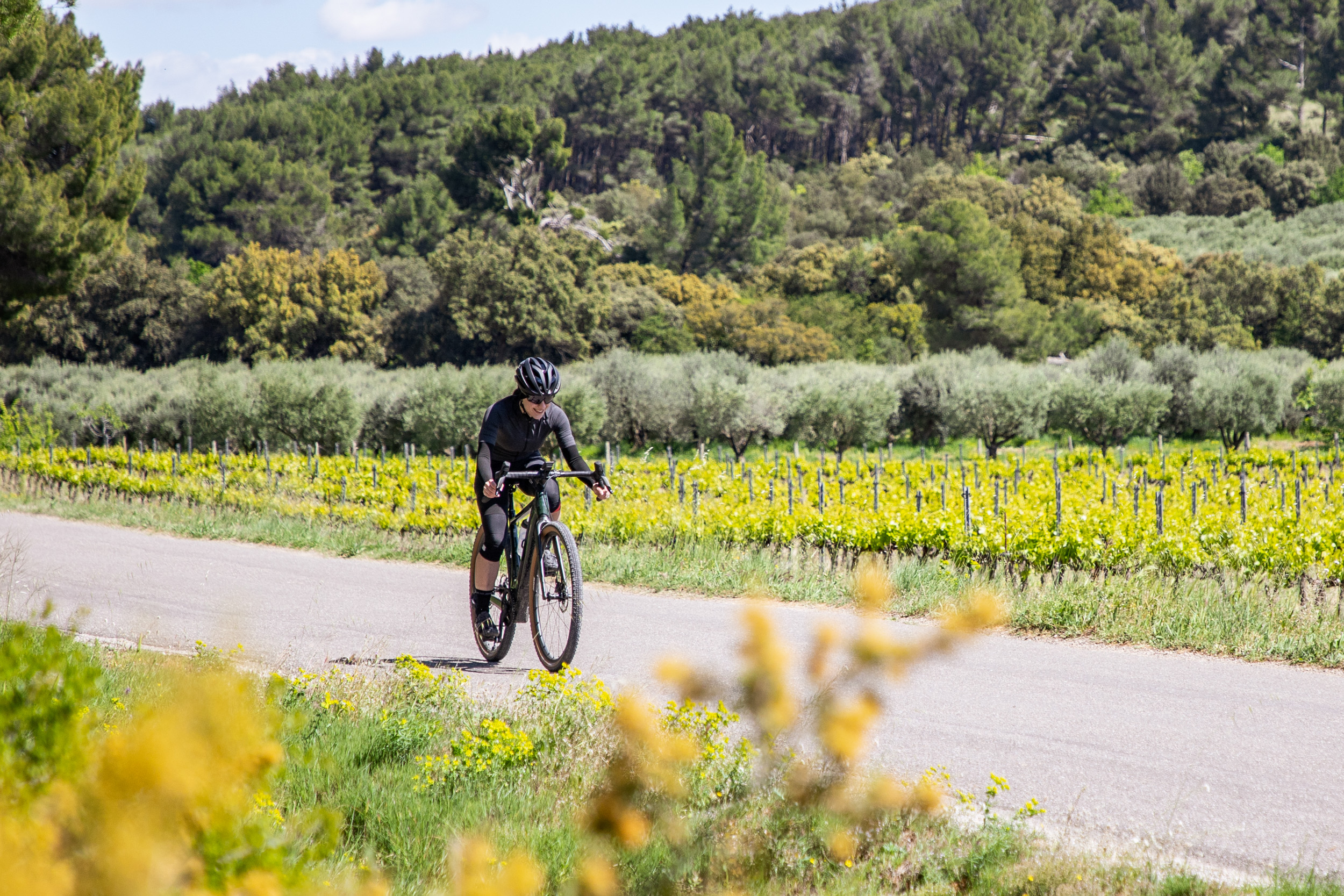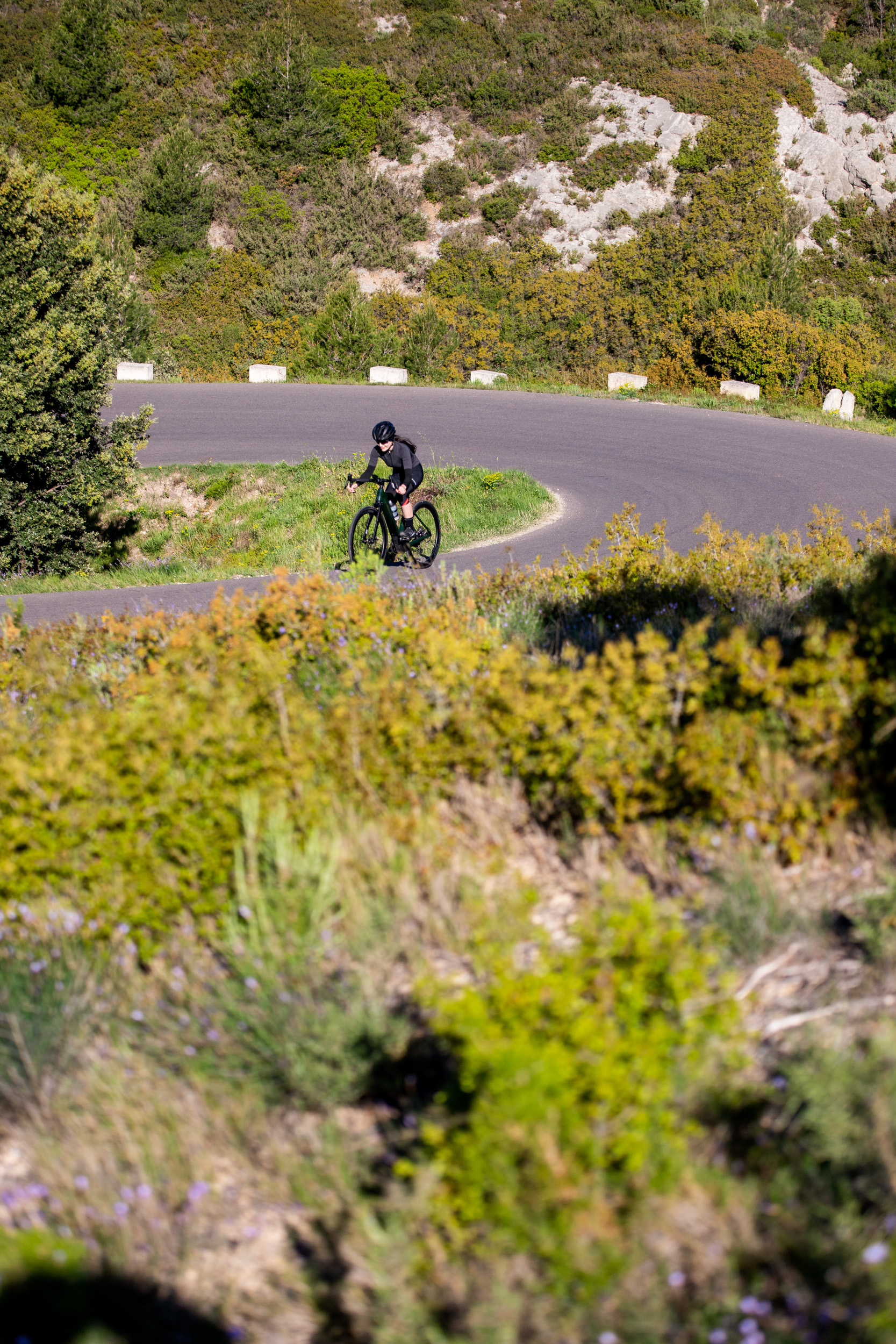 Die Geometrie der Dimanche-Modelle ist sportiv (als aggressiv würde ich sie allerdings nicht bezeichnen) und bietet sowohl Einsteigern als auch erfahrenen Fahrern eine komfortable Sitzposition. Stack und Reach bewegen sich am unteren Ende der üblichen Skalen. Mein sehr weiter Lenker und die Laufruhe des Bikes haben mir in den kurvigen Abfahrten bei den berüchtigten Mistralwindböen Südfrankreichs die Sicherheit gegeben, nicht sofort davongeweht zu werden. Auf schmaleren Schotterstraßen achtete ich allerdings vermehrt auf die Gruppe um mich, da die Ausweichmanöver weniger direkt von der Hand gingen - was allerdings bestimmt auch daran lag, dass der Rahmen beinahe zu groß für mich war.