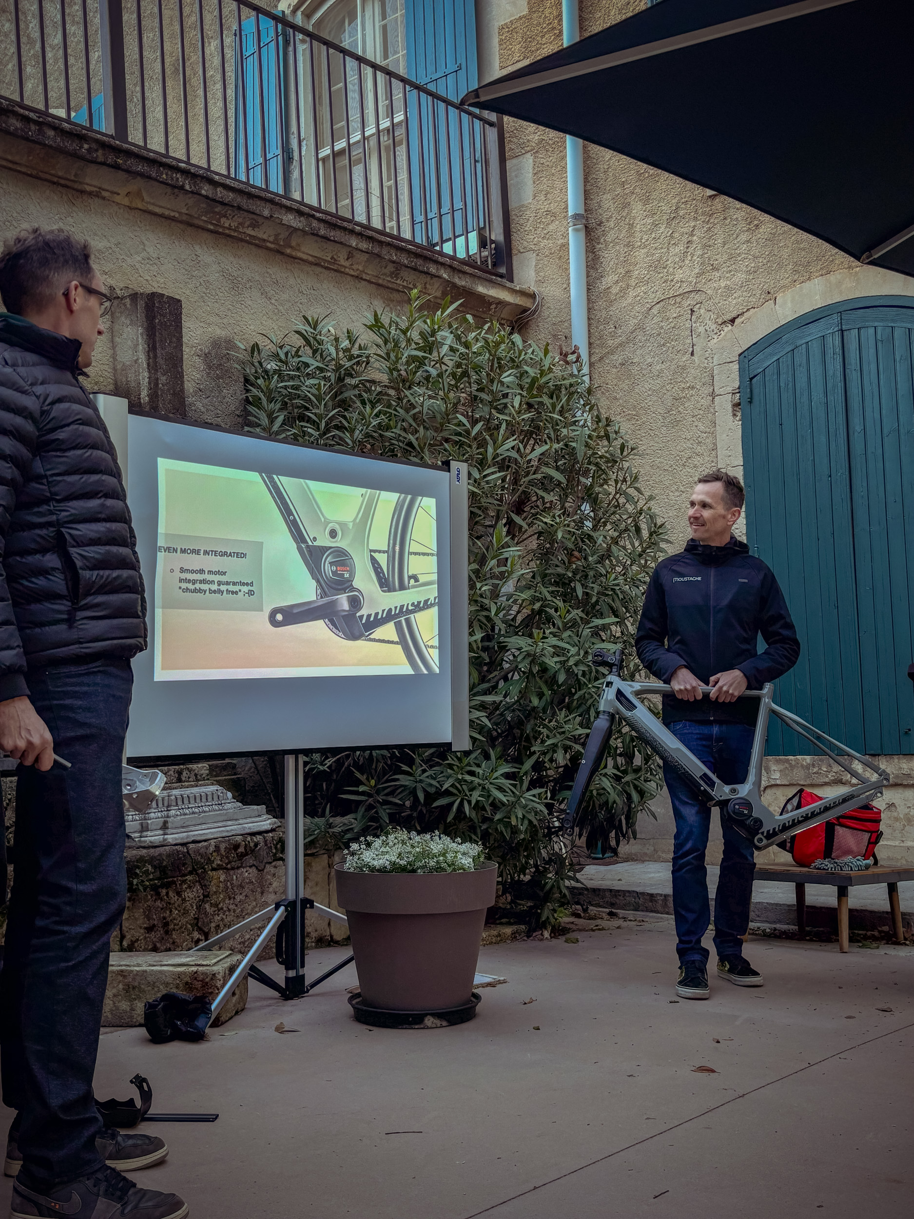 Rudy Megevand (R&D) und Clément Bonneau (Media & PR) präsentieren die neuen Dimanche-Bikes beim Press Camp